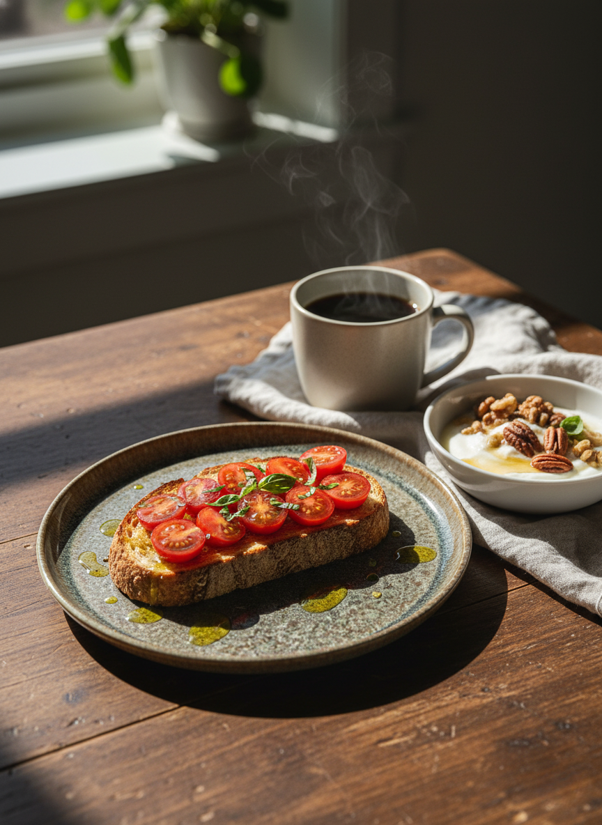 🫒 Aceite de oliva virgen extra, jamón serrano, tomates cherrys, un toquecito de pimienta negra, y voilá.